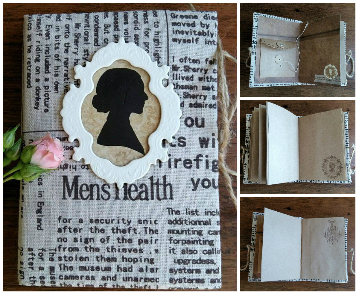 Крафт-блокнот ручної роботи. Формат - А6 (105 x 148мм), зістарені аркуші, на форзацах папір архівної якості з колекції "Et cetera" BoBunny, також використані прикраси з цієї ж колекції, перший форзац прикрашений крафт-конвертиком від Maya Road для маленьких дамських секретиків) М'яка обкладинка, льон з газетним принтом. Деякі сторінки проштамповані ретро-зображеннями від Viva Decor.