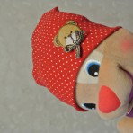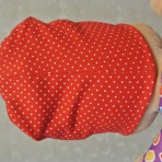 шапка красного цвета в мелкий горошек с Мишкой- двойная, тонкая вязка, х/б - носили в прохладное лето, очень теплую осень или весну в возрасте 8-9 мес и еще в 1 г. 4 мес