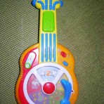 На корпусе гитары рычажок, при нажатии на который начинает крутиться диск, и в окошечке появляется то или иное животное. Малышам особенно нравится нажимать на этот рычажок:))