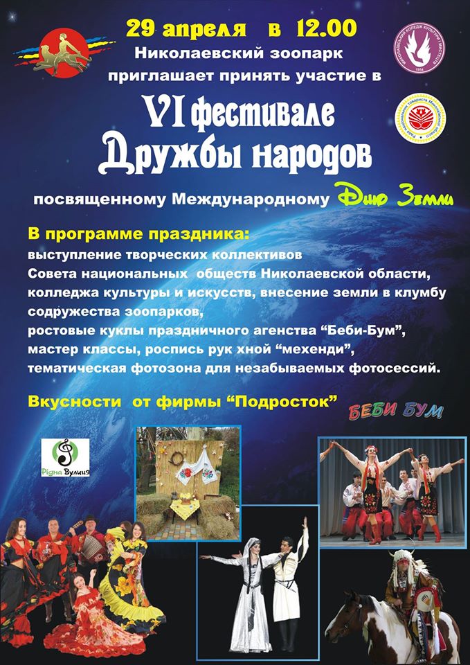 В следующую субботу, 22 апреля, в Николаевском зоопарке пройдет VI фестиваль Дружбы народов, посвященный Международному дню Земли.