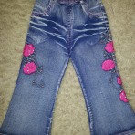 Джинсы с карманчиками и красиво вышиты розовые цветочки по бокам штанин. Нужно только вытянут ниточку. Мы ходили так, потому что нам карманы не нужны были. Длина штанины от пояса 53 см. Внутренний шов - 33 см. Сзади есть один карманчик на правой штанине. Пояс на резиночке, что очень удобно.