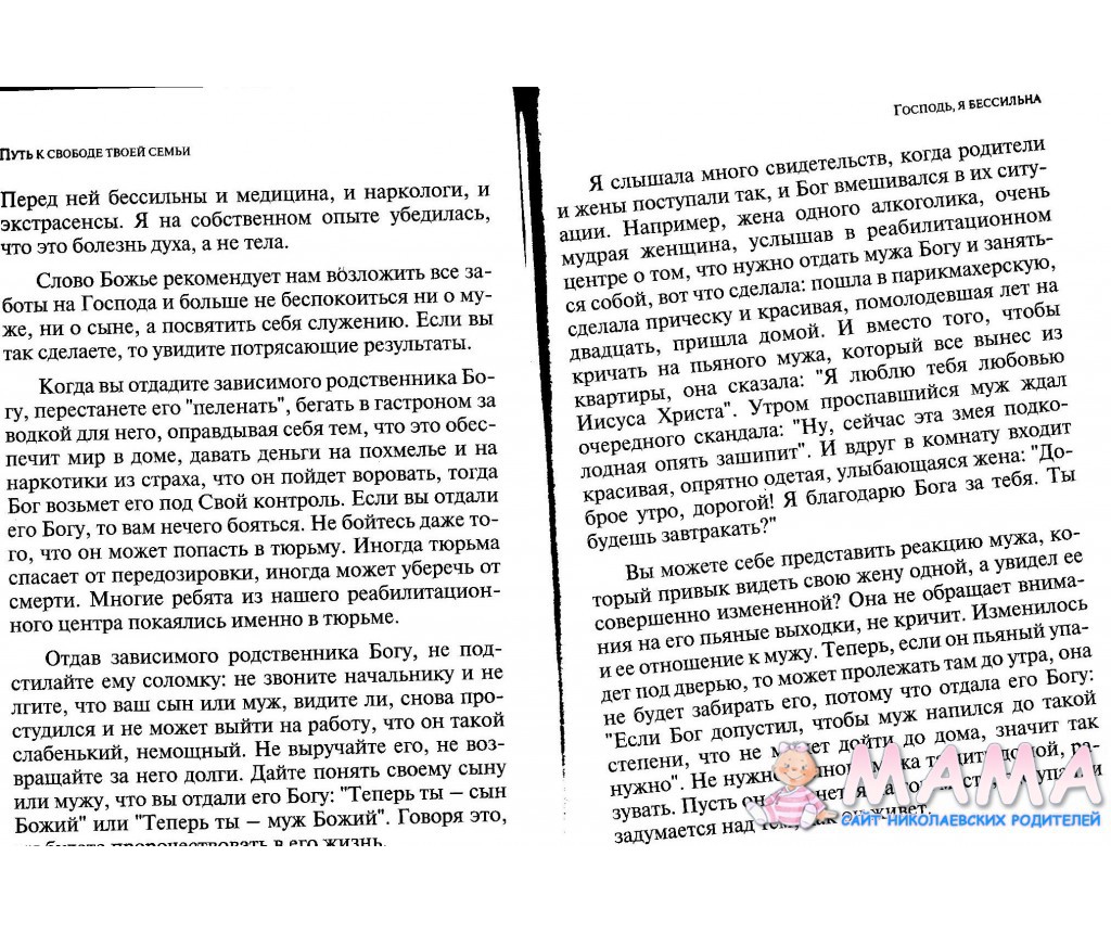 У меня дома, где-то валяется книжка, какой-то из новомодных церквей, которые сейчас берутся наркоманам и алкоголикам возвращать мозги. Я первые несколько листов только просмотрела, но мысль там очень интересная.