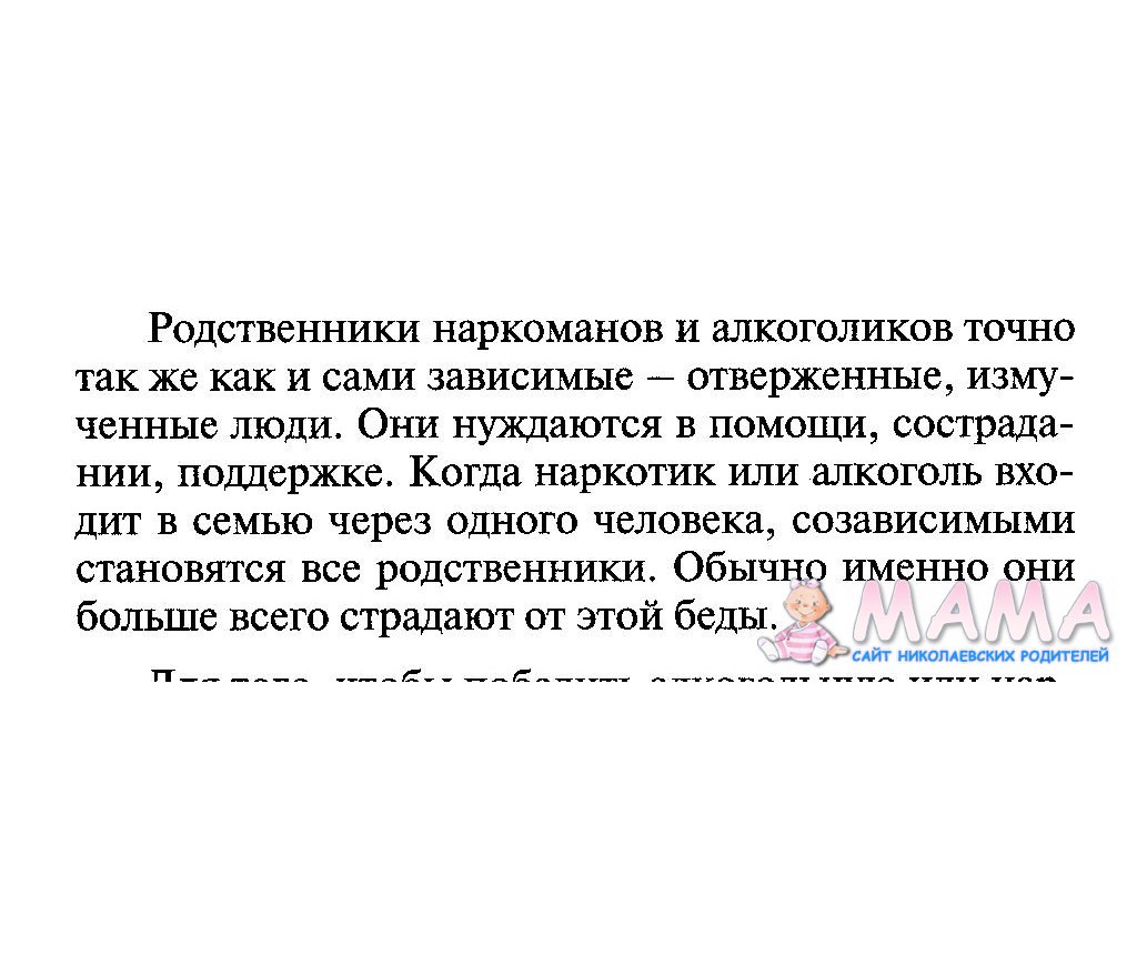 28 December 2010 Цитата: #6024 Nataluska.ru 27 December 2010, 17:32Может кому то будет не интересно читать мою тему, но у меня уже до такой степени все напекло, что хочется броситься и бежать. История моя такова. У меня есть родной брат по маме, которому уже 33 года (разница у нас в 9 лет), и именно он не дает мне спокойно жить, а может вообще я сама себе проблему создала. Мама наша два года назад умерла от опухали мозга, в то время она не знала что брат сидит в СИЗО за мошенничество. Все время до этого он сильно пил, не давал покоя матери, а она в тоже время очень сильно изводила себя из за него, переживала, что с ним будет дальше. За несколько недель до маминой смерти, он сидел пьяный в ближайшем баре, и рассказывал всем, что мама присмерти. Я была в шоке когда узнала об этом, и сказала тогда маме, что если с ней что то случиться, я откажусь от брата навсегда. Услышав об этом мама стала очень сильно плакать и просила чтоб я этого не делала. Мама умерла, так и не узнав, что он сидит в тюрьме. Через три месяца после ее смерти его выпустили, он поехал к маме на могилку, на коленях просил прощения, обещал больше не пить, но слово свое продержал лишь три дня. Сейчас он просто бомж с крышей над головой. Живем мы в одном доме, только на разных этажах, он постоянно просит есть, а я ворую с дому тарелки, что бы муж с папой не видели. Вообщем я не могу остановиться, подруга говорит что я сама виновата, кормлю его, а он и лыком не вяжет, что бы на работу пойти, но у меня душа пополам разрывается, как только я ему отказываю в хлебе, сразу мама перед глазами стоит и плачет, как будто просит, что бы я не отворачивалась от него. И вот что мне делать, не могу я отвернуться от него совсем, а по другому, на шею братец лезит, может вы скажете что я дура, но как бы вы поступили на моем месте. Извините за длинный рассказ, и спасибо что дочитали до конца