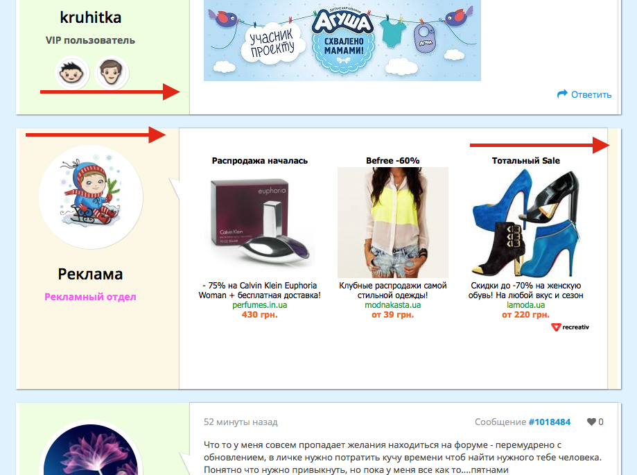 Вот здесь на скрине не совпадение полей с сообщениями пользователей и "глупой" рекламой! Стрелочками показала, где именно сие чудо....