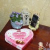 Вика (КеТьКа) очень милая девушка и немного застенчивая, так мне показалось))) Привезла подарок мне на работу - огромный цветочный бутон и открытка, сделанная своими руками из бисера. Цветок я довезла домой целым и не вредимым, Вика предупредила ,что внутри цветка что-то бьющееся. Открыв подарок, я обнаружила керамическую подставку для мобилки в виде коровки (уже используется мной по назначению), подсвечник для ароматических свечей в египетском стиле и горшочек с живыми цеточками, кстати, как они называются? Горшочек в виде слоника, поставила на кухне. Сынуля успел попробовать на зуб один цветочек, остальное успела спасти)) Из цветка, в который был упакован подарок, муж придумал сделать абажур для ночника над дочкиной кроватью))))))