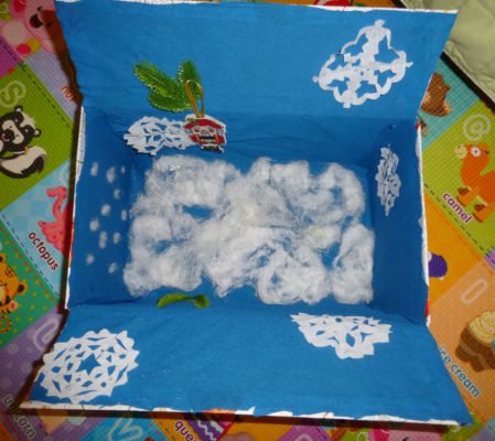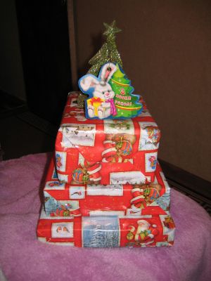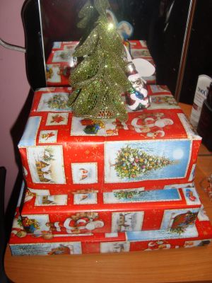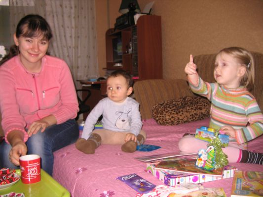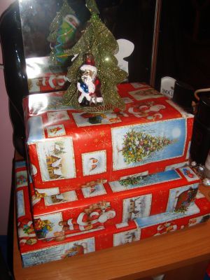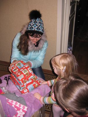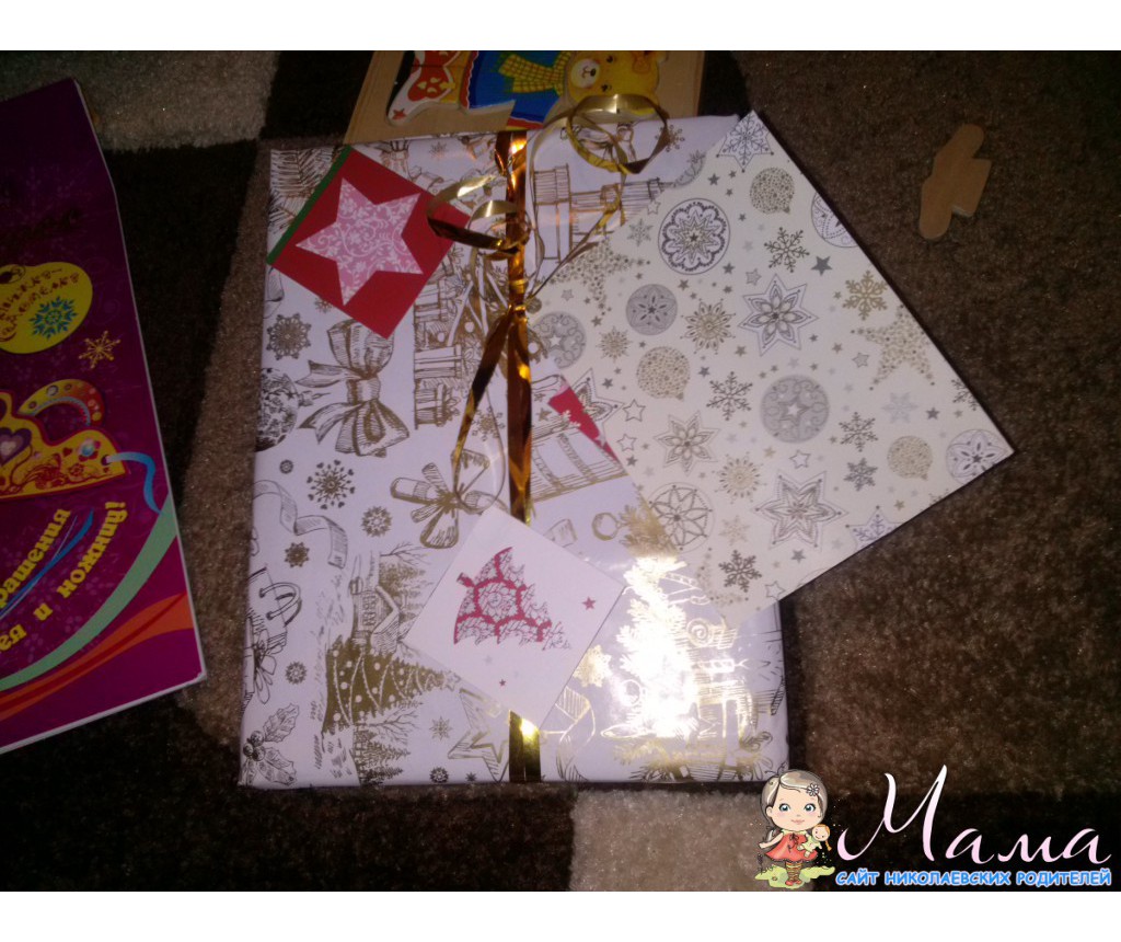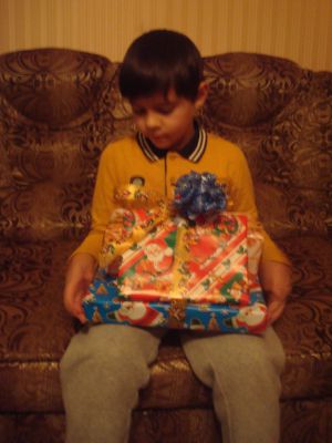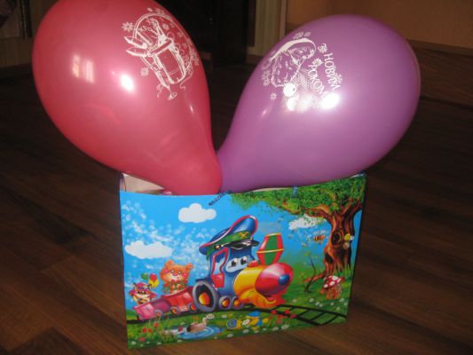 Итак, нам сегодня утром позвонила Снегурочка, и мы отправили нашего папу на встречу с ней. Папа доставил "ценный груз", получив указания надуть шарики, которые Снегурочка вложила в подарок. Папа так старался, что один шарик лопнул