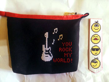 Все подарочки: классный вечный календарь, нужно самим написать месяцы, цифры, я такой раньше не видела, набор прикольных фломастеров. Даша в восторге от косметички с вышитой надписью - рок