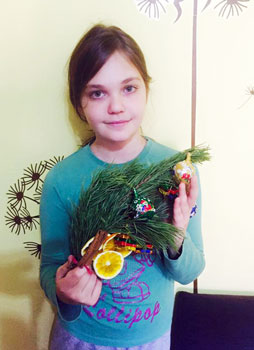 Открыли, а там такой невероятный волшебный запах))). Пахла сосновая веточка, а на ней украшения из апельсинов, корицы и шоколада. Еле уболтала Дашу сфоткаться, так что видок еще тот))).