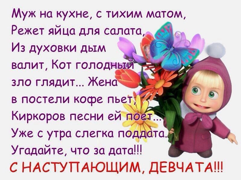 Девчата,с праздничком всех! В этот день желаю получить те подарки,что вы заказали! И напачкать много посуды,все равно мужики сегодня дежурные по кухне!
