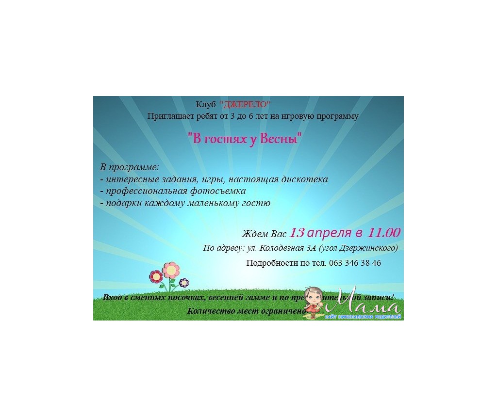 12 April 2014 Уважаемые родители! В связи с непредвиденными обстоятельствами игровая программа "В гостях у Весны", которая должна была состояться 13 апреля - ПЕРЕНОСИТСЯ на 18 апреля (17.00)!