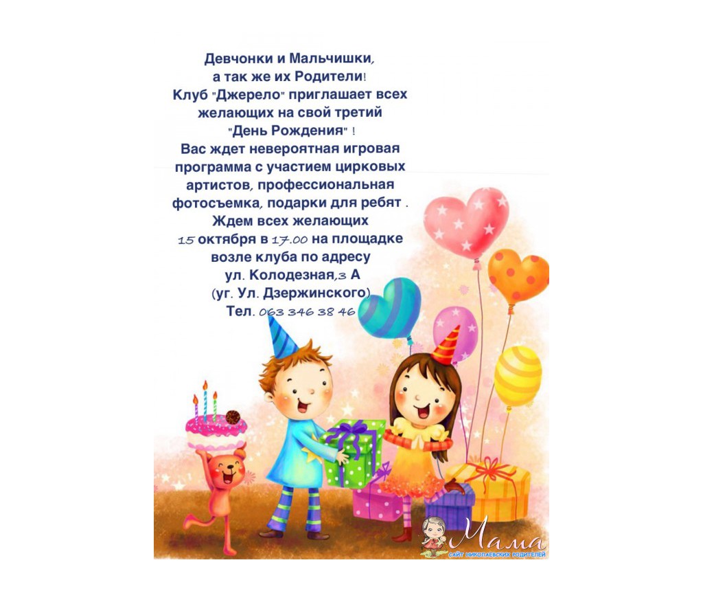 Девчонки и мальчишки, а так же их родители Клуб "Джерело" приглашает всех желающих на свой третий "День Рождения" Вас ждет невероятная игровая программа с участием цирковых артистов, профессиональная фотосъемка, подарки для ребят Ждем всех желающих 15 октября в 17.00 на площадке возле клуба по адресу ул. Колодезная, 3 А (уг. Дзержинского) Тел. 063 346 38 46