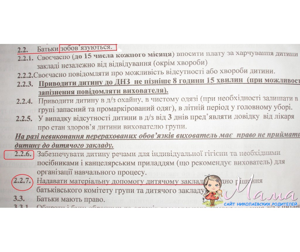 Правда коли вже прийшли в сад нас попросили підписати договір, де написано в обов'язках батьків: надавати матеріальну допомогу згідно рішення батьк. комітету. Я написала, що цей пункт зобов'язуюсь виконувати по мірі можливостей. Ну завідуюча зробила вигляд, що не розуміє про яку допомогу я говорю і сказала,що я зобов'язана сплачувати лише харчування.)))