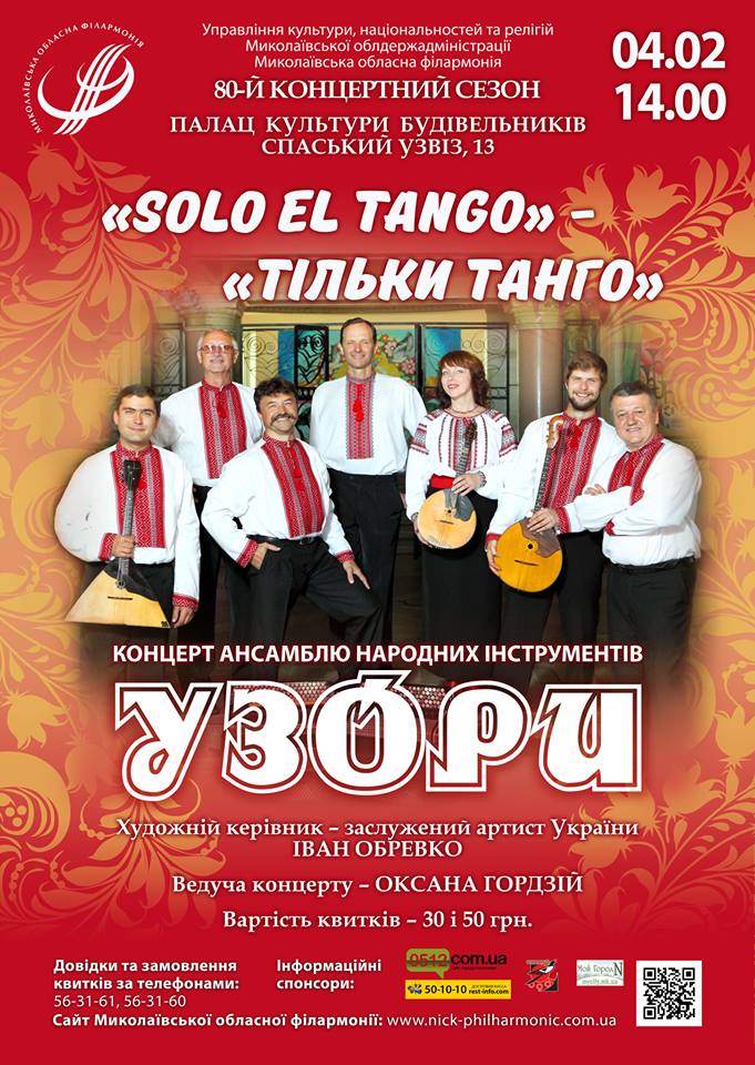 4 лютого о 14:00 в концертний зал Палацу культури будівельників, вул. Спаський узвіз, 13 (Сухий фонтан) на концертну програму «SOLO EL TANGO» - «ТІЛЬКИ ТАНГО»