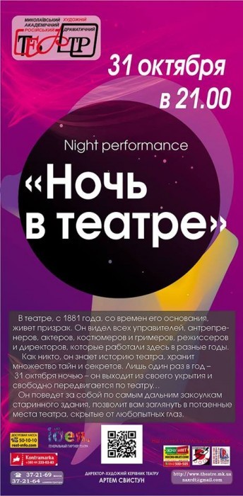 Жителей города приглашают провести интересную ночь в стенах Николаевского художественного русского драматического театра. Всех желающих ожидает очередное интересное мероприятие - «Ночь в театре», которое состоится 31 октября в 21:00. В ходе мероприятия планируется спектакль-концерт «Навстречу» и знакомство с призраком театра