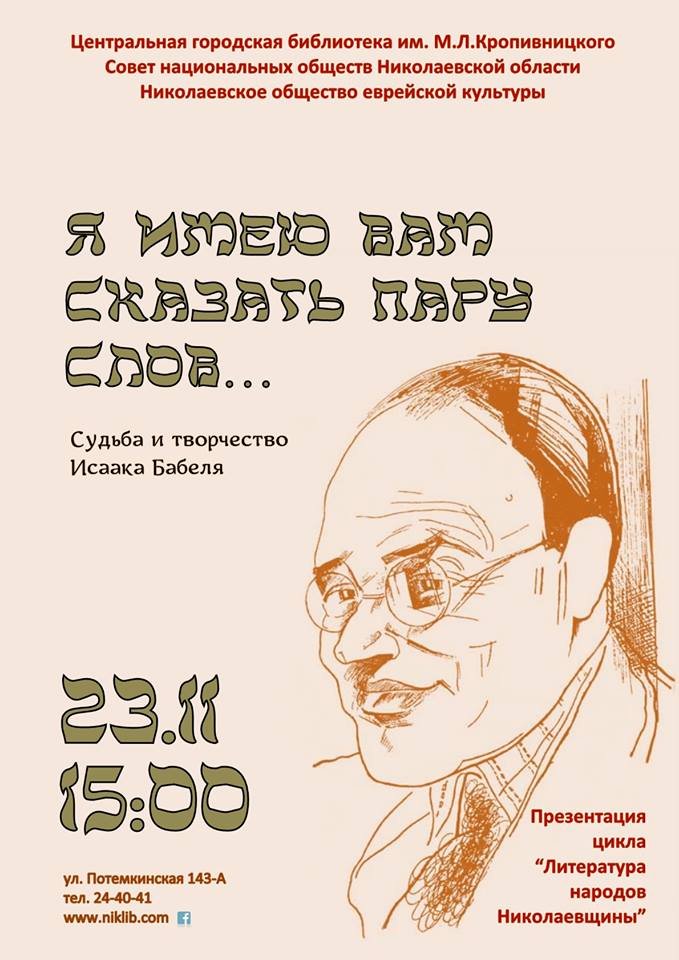23 ноября 2017 года в 15:00 Центральная городская библиотека им. М.Л. Кропивницкого приглашает на литературный вечер «Я имею вам сказать пару слов…», посвященный судьбе и творчеству замечательного еврейского писателя Исаака Бабеля. Этот вечер открывает литературно-художественный цикл «Литература народов Николаевщины», который инициирован Советом национальных обществ Николаевской области и поддержан национально-культурными общинами города. Вас ожидает увлекательный рассказ о жизни художника слова, интересные исторические и филологические комментарии, громкие чтения фрагментов литературных произведений, отрывки из старых фильмов, звуки скрипки. Партнер подготовки и проведения литературного вечера – Николаевское общество еврейской культуры.