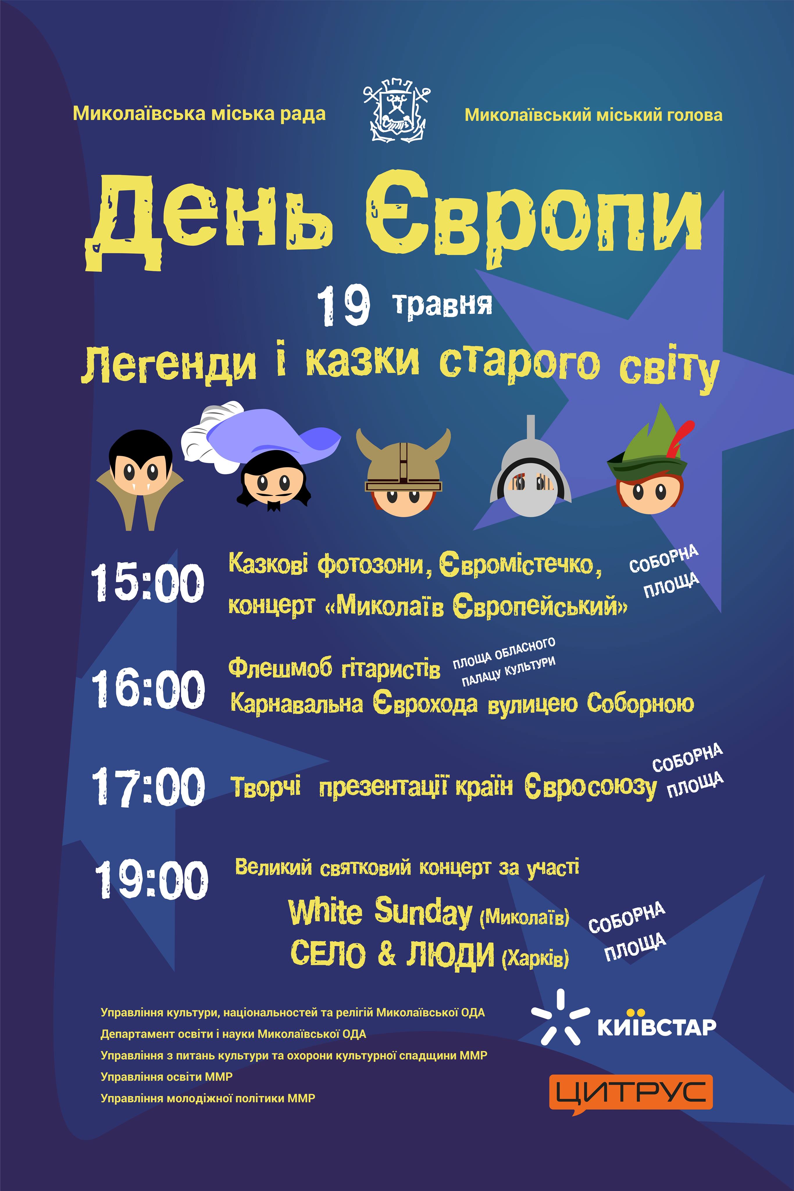 Также в этот день горожан ожидают: сказочные фотозоны и Еврогородок на Соборной площади, карнавальное Еврошествие по улице Соборной и гала — концерт клубных учреждений «Николаев Европейский». Изюминкой Дня Европы в Николаеве станет гитарный флешмоб при участии более 150 музыкантов под руководством гостя из Германии — дирижера Ганса Вильгельма Кауфманна.
