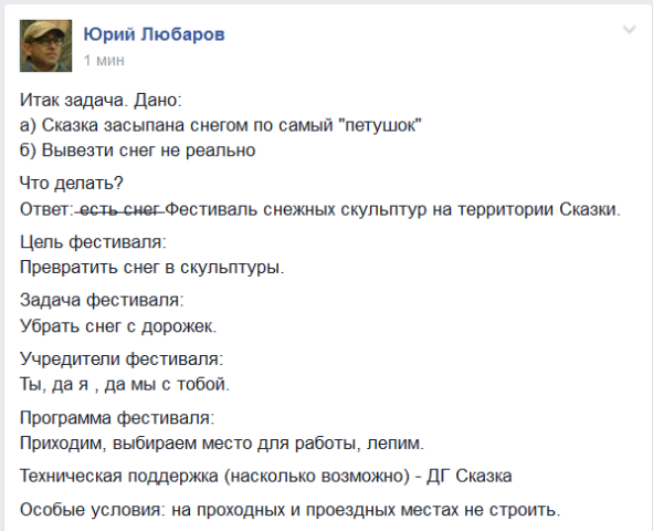 А предшествовало презентации работ приглашение директора городка Юрия Любарова немного расчистить территорию «Сказки», использовав снег весьма необычным для города способом — в качестве строительного материала для будущих творений. На следующий же день николаевцы откликнулись — и уже со вторника на площади городка, где ранее располагалась главная елка Заводского района, собирались целыми семьями, закладывая фундамент под будущие фигуры.
