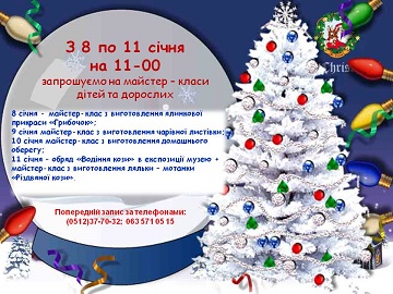 Продовжує працювати майстерня Діда Мороза. З 8 по 11 січня запрошуємо любителів майстер – класів на 11-00 до музею. На вас чекають: самостійні прогулянки з путівником, екскурсії, обряди і головне, цікаві майстер – класи.