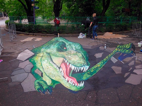 Кто на днях был в зоопарке - там действительно появился такой рисунок? Фото из соцсети, мелькнула мысль, что может фотошоп, но видно, что участок огорожен. Вот такой динозаврик :)