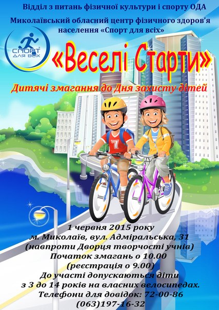 1 июня 2015 года ко Дню защиты детей на улице Адмиральской (Площади Ленина) Николаевский областной центр "Спорт для всех" организовывает "Веселые старты" на велосипедах. Участие в соревнованиях могут принять все желающие в возрасте до 14 лет.