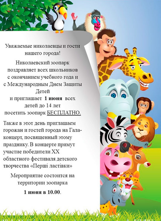 10:00 Праздничная концертно-игровая программа ко Дню защиты детей (Николаевский зоопарк, площадь Леонтовича, 1)