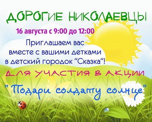14 August 2014 Друзі, волонтери влаштовують акцію в "Сказке" 16 серпня з 9.00 до 12.00 "Подаруй солдату сонце". Приходьте з дітками: