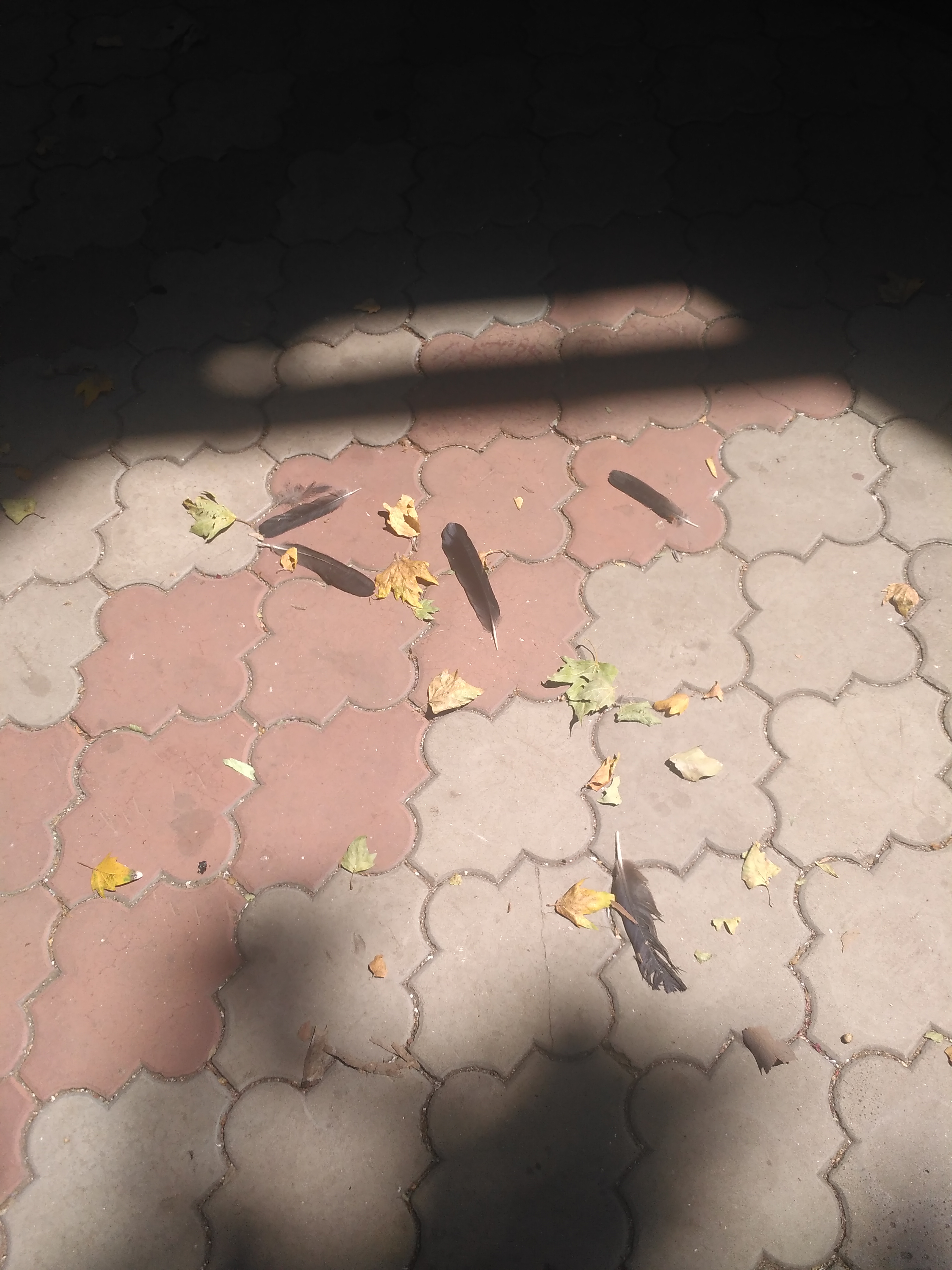 На днях проходила мимо - под загсом валялось несколько черных вороньих перьев. Шла вчера ещё раз - накидано перьев десятка два, будто целого ворона тут распотрошили. И по округе тоже раскиданы