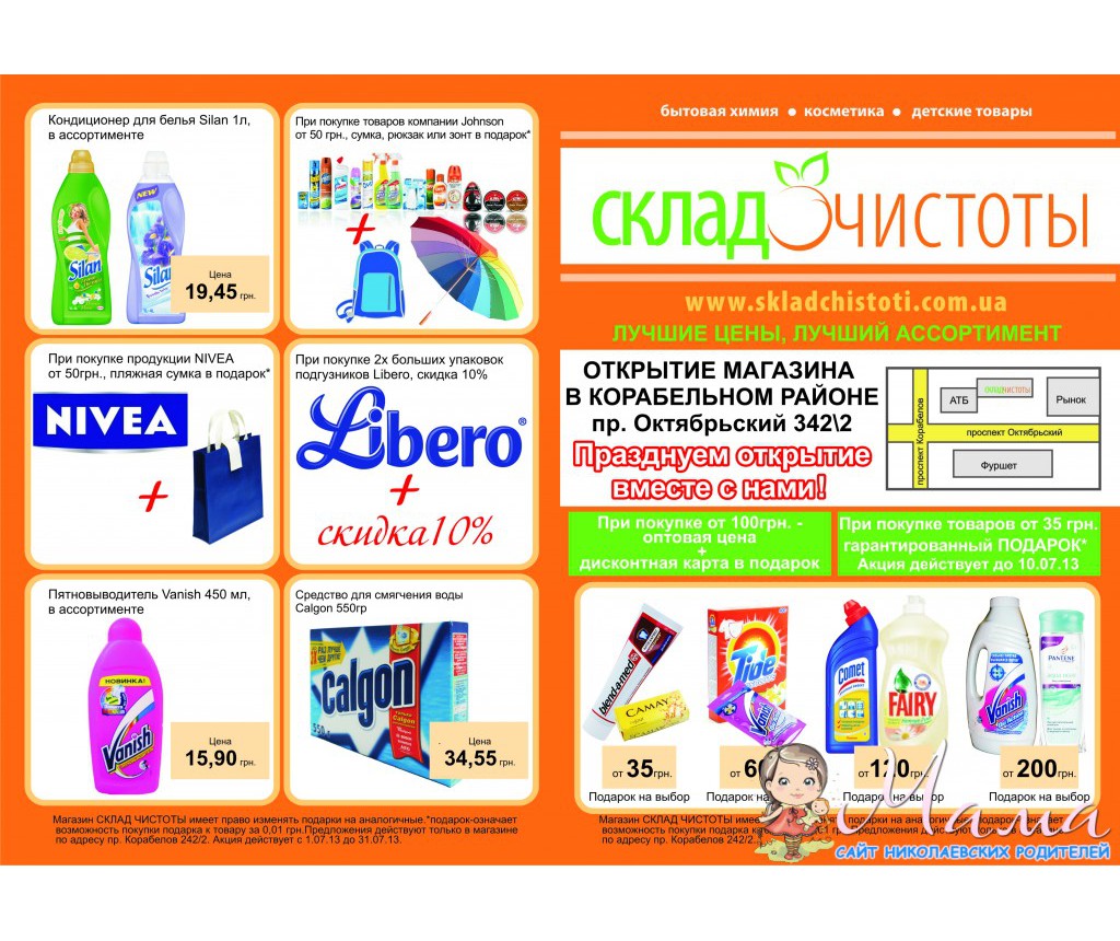 10 July 2013 Цитата: #8673 Склад Чистоты 09 July 2013, 18:22Открытие магазина СКЛАД ЧИСТОТЫ по пр. Октябрьскому 342\2 (около АТБ, 2этаж)С 1июля по 10 июляКаждому покупателю подарок при покупке от 35грн