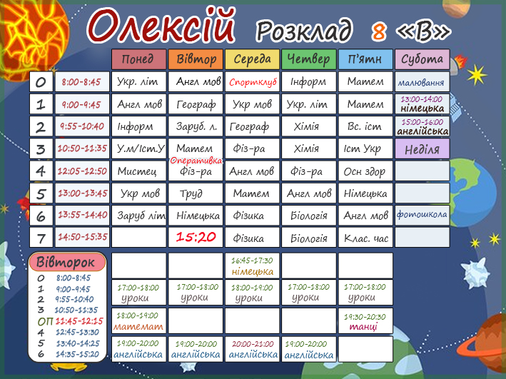 А понедельник у вас день тяжелый :) Я почему-то думала, что в гимназии уроки начинаются в 9, а вы аж с 8.И еще что такое І.Ч по вторникам, почему музыка через дробь с ОТМ и на карате вы больше не ходите?