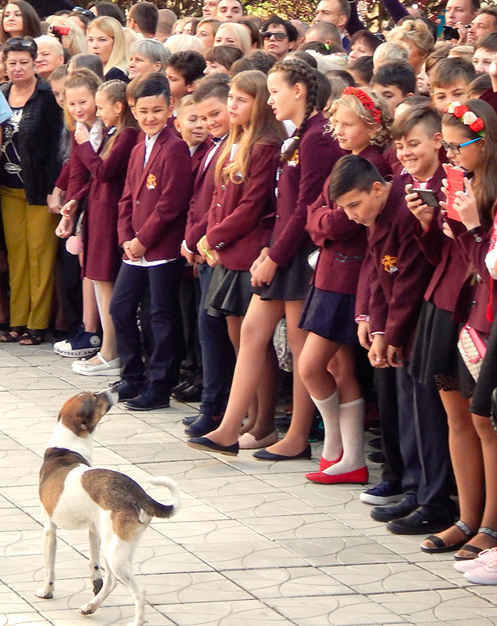 Дети вокруг так радостно общались, что не было слышно ни-че-го! Впервые видела такое оживление во время линейки, обычно все чинно стоят. Сонных лиц точно ни одного вокруг себя не видела. Особенно порадовали детей два события: неведомо как пробравшаяся в середину линейки собачка и летающий над школой дрон. Запуск шариков и салют из блестящей фольги - тоже, конечно, но к этому дети уже привыкли.