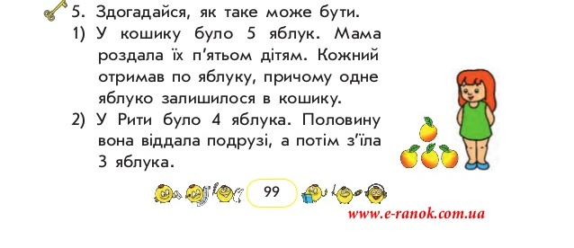 2. Рита отдала половину яблока. Это задача для еврейских детей, но мой сын тоже так мыслит ))
