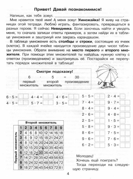 Собственно, кроссворды тут ни при чем. Ребенку предлагается просто находить результаты в квадратной таблице Пифагора, выписывать их и заштриховывать нужные клеточки. В результате получается картинка, связанная с текстом-путешествием героя. Заучивание результатов происходит практически автоматически.