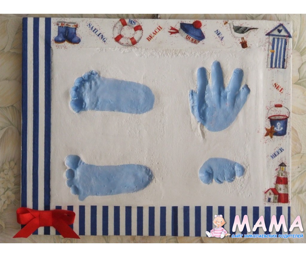 18 December 2011 Цитата: #1191 manюnya 17 October 2011, 20:30Мы как родители подарили своему ребенку слепки ножки и ручки, получилась картиной на которую прицепили пуповину, первую соску, пинетки и конвертик для волос.