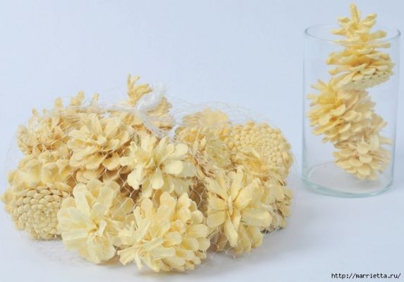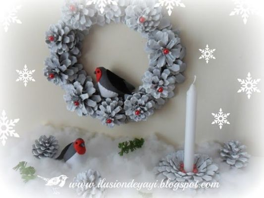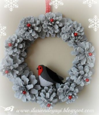 Всем привет. Вот решила сделать новогодний венок из шишек. Подскажите пожалуйста, как вы думаете?????? Шишки обработаю в духовке, потом их можно отбелить, фото 3, но не знаю как красивее будет на отбеленные шишки наносить краску или на натуральный цвет. Возник еще вопрос по поводу того какой краской их обрабатывать ( хочу чтоб шишки получилось как на фото 1). И последний вопрос думаю сделать каркас из пенопласта и при клеить их на термопистолет, но можно еще как на третем фото круглешки при клеить к шишкам и нанизать на проволоку, но мне кажется, что получится хрупкий венок. Кто как думает? |