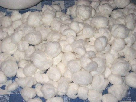 2. Скатываем из ваты шарики и нанизываем их на ниточку с иголкой, а нитку предварительно смочить в ПВА, чтобы вата не соскальзывала.