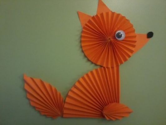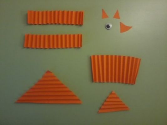 Лиса.Точно также как у зайца выполняем голову. Полоса шире - туловище, складываем гармошкой в четверть круга, приклеиваем к основе. Хвост - большой треугольник, лапки - маленький треугольник. Соединяем детали, приклеиваем мордочку, ушки, глаз.