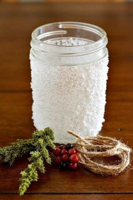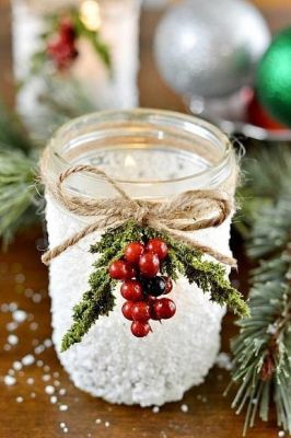 Свечи всегда здорово украшают новогодний интерьер. А если их нужно расставить много, например обычные греющие свечи в алюминиевой фольге, то поместить их можно вот в такие баночки, украшенные джутовой веревочкой и искусственными или настоящими ягодками и еловыми или веточками туи. А сама баночка промазывается клеем пва и густо посыпается крупной солью. Если хочется, чтобы баночка была непрозрачной, в клей можно добавить немного белой акриловой краски. Да еще, в баночку из под детского питания свеча помещается идеально.