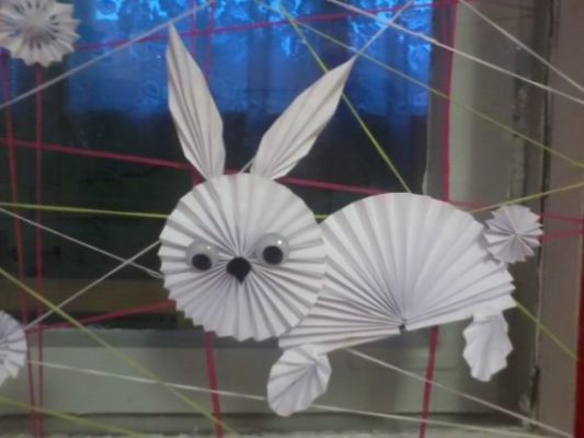 Заяц.Для изготовления зайца нам нужны две полоски бумаги для головы, их складываем гармошкой, собираем в круг. Широкая полоса бумаги - для туловища. Её складываем в полукруг, приклеиваем к основе. Уши и лапы - из треугольников. Соединяем все части с помощью клея, зайчик готов.