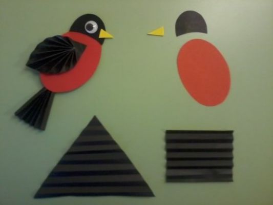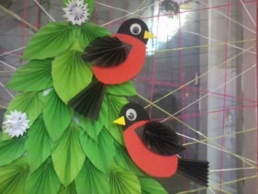Снегири.У снегирей гармошкой складываем крылья из треугольников, хвост - из прямоугольника. Снегири могут сидеть на ели или летать рядом.