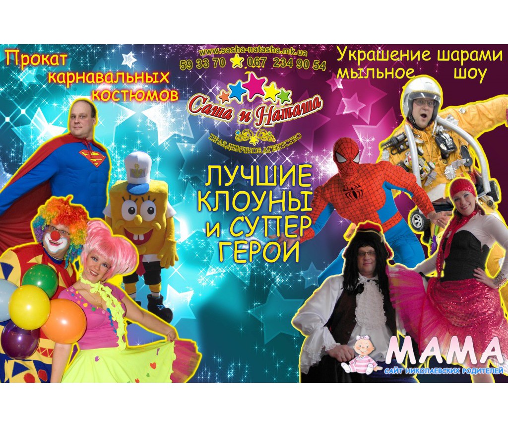 Ведущие, тамада, г. Николаев, клоуны на детский день рождения, свадьба, юбилей, выпускной, новогодний корпаратив, украшение шарами, мыльное шоу, Агентство "Саша и Наташа" Александр 8 (0512)593370, 067 2349054, Е-mail: igrotex71@mail.ru www.sasha-natasha.mk.ua