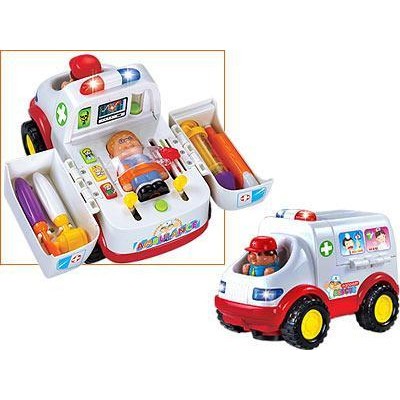 Там дві фігурки - водій та пацієнт, чотири різні медичних приладдя і звукові ефекти - рентген, кардіограма, кашель і кілька мелодій. Машинка їздить і виє сирена (але ця функція, на щастя, окремо вимикається).