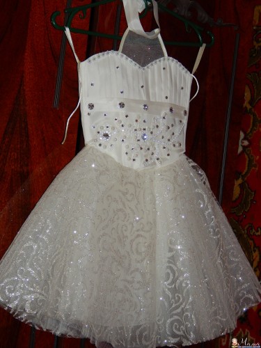 У нас есть такое платьице.Очень красиво смотрится!Ваша снежинка будет самой красивой на празднике!Подойдет на девочек 2.5-4 лет.Нам сейчас 5,рост 105см,худенькая-влазим нормально.Длина платья от подмышки-53см.,ширина подмышками-27см,в талии -25см,сзади-змейка и шнуровка.