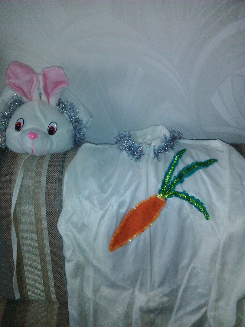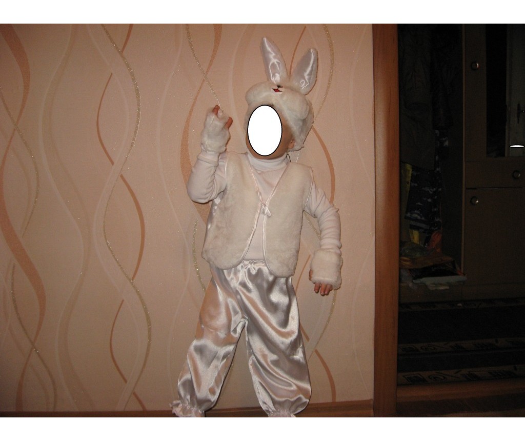 Есть костюм зайчика на возраст от 2 до 5 лет. подойдет как мальчику, так и девочке.в комплекте шапочка ввиде мордочки зайчика,желетка, перчатка и атласные штаны