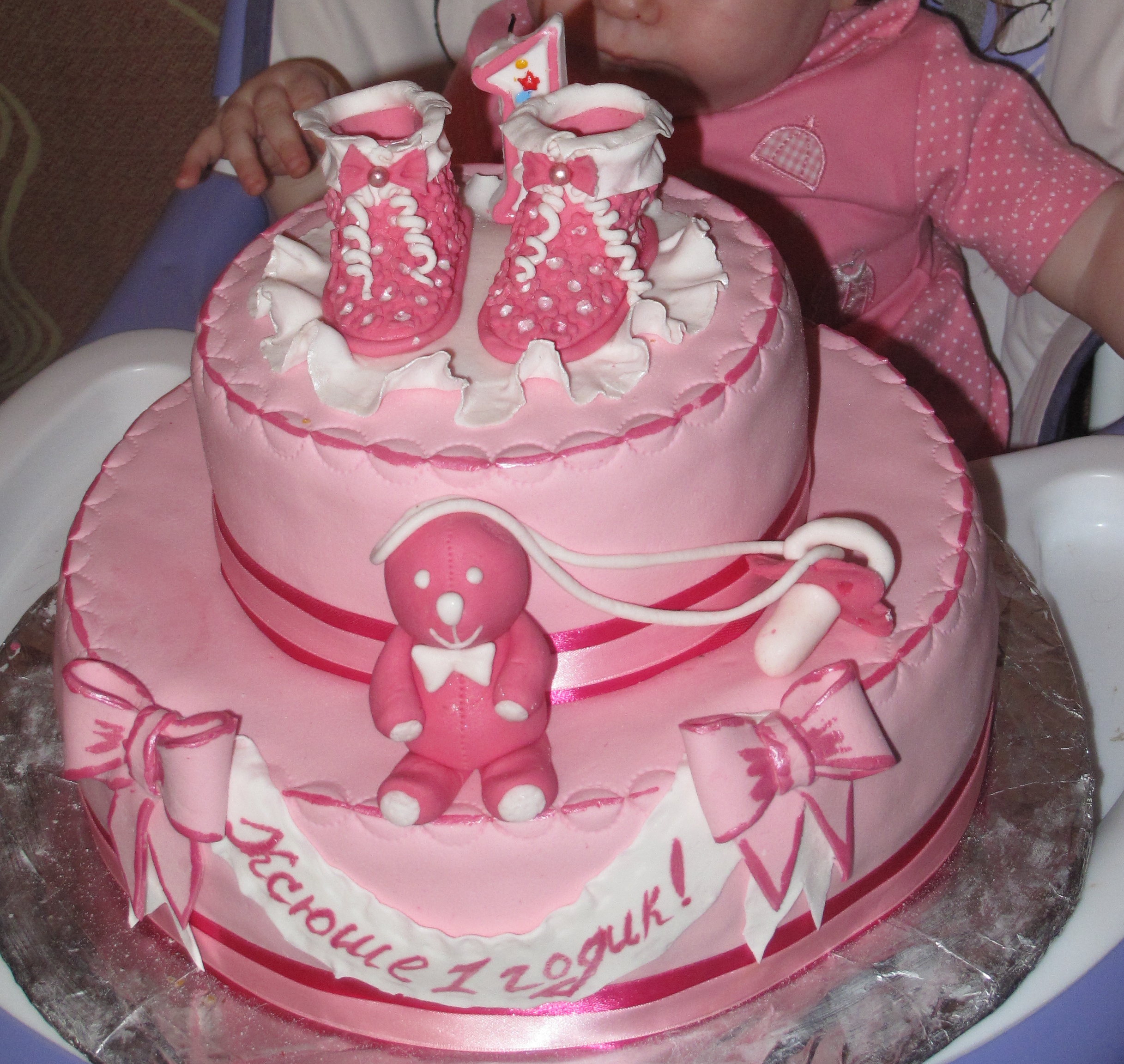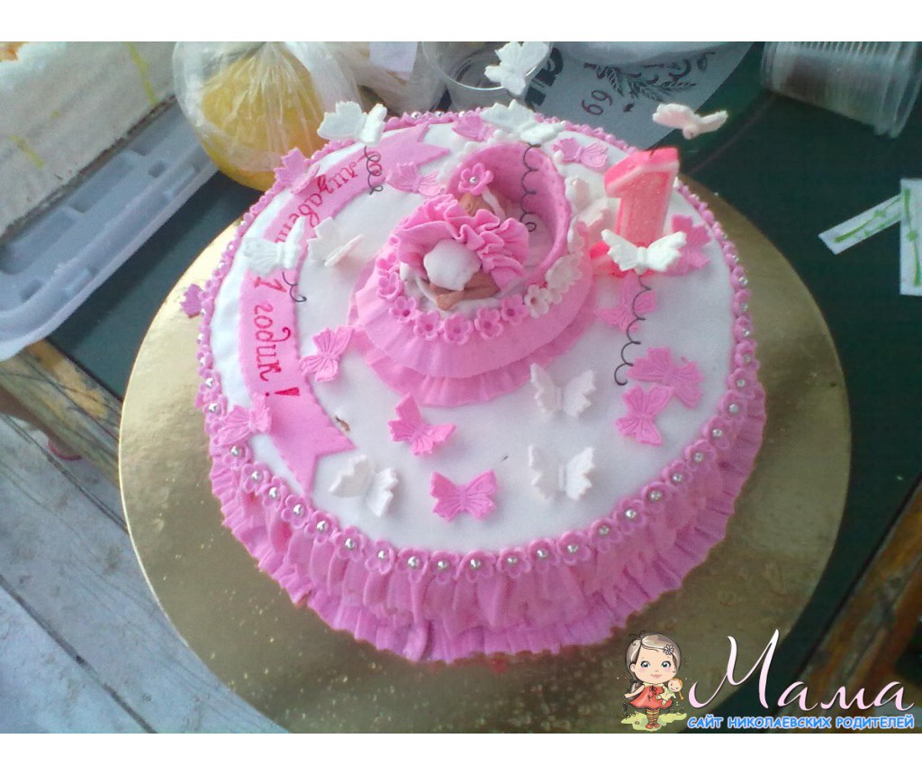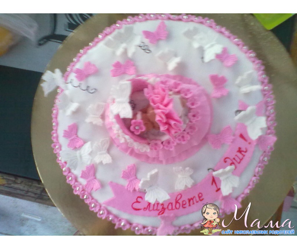 у нас тоже такой тортик был,только в *мальчиковом* варианте-белый с голубым и на цветке на лилии наш волосатенький ляль лежал.и тоже с весом не расчитали-расчитывали на 3 кг,а получили 4,5)) фоток пока нет,только вчера отпраздновали и еще доедаем тортик,вкуснющий-медовые коржи,сметанно-масляный крем+вишня_орешки.