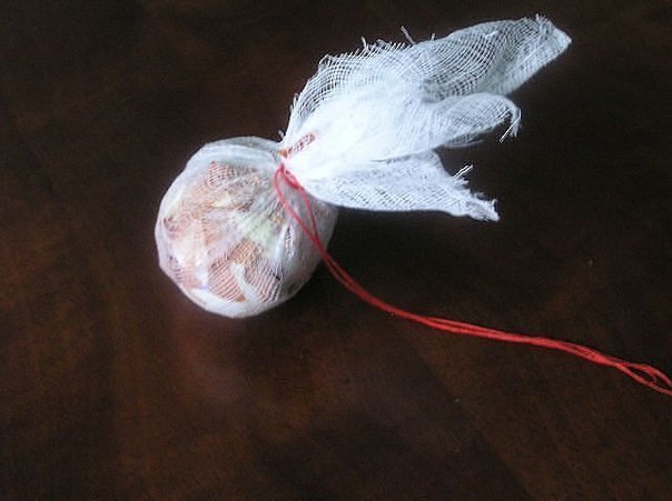 4. Марлю туго завязываем и аккуратно распределяем шелуху, где сместилась.