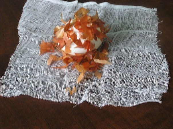 3. Выкладываем яйцо на марлю и немного подсыпаем шелухи.