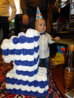 Потом все написали на карточках пожелания и запечатали их в конверт. Крестная состригла нам первый локон. И сынок получил персональный именинный торт)