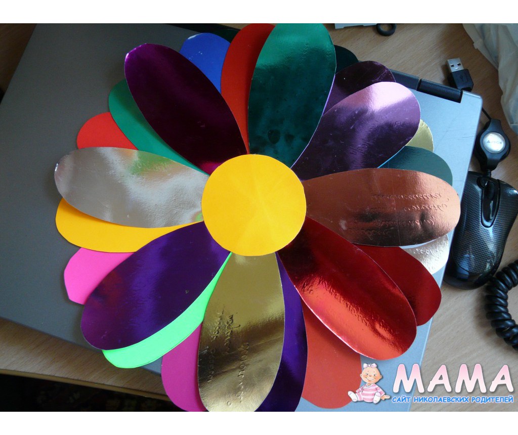Для этого конкурса мне понадобились четыре баночки разного детского питания. Я обернула их фольгой, а на крышке наклеила номера. Гости получили фломастеры и бумагу, и я поставила задачу: попробовав содержимое, определить, из чего сделано пюре; ромашка - на ее лепестках вопросы;