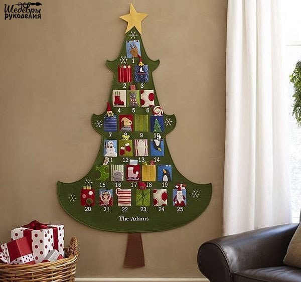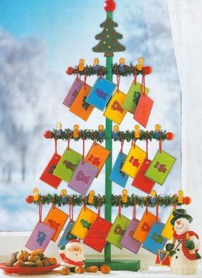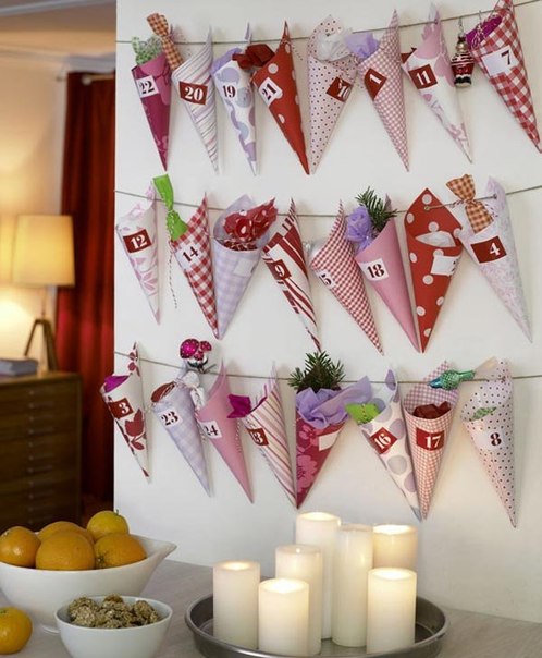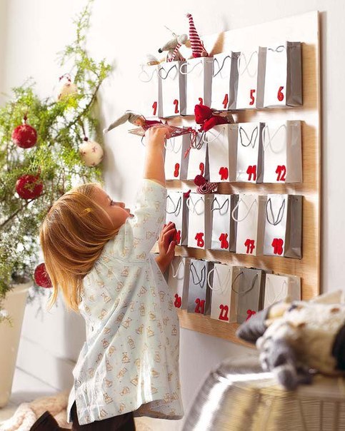 Я долго раздумывала над таким календарем, но из-за моей младшей разбойницы,она просто все сразу откроет и слопает, решила просто на календарь вешать красивый маленький новогодний мешочек и туда накупила маленькие шоколадки милка, сегодня с утра такой мешочек висел)