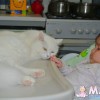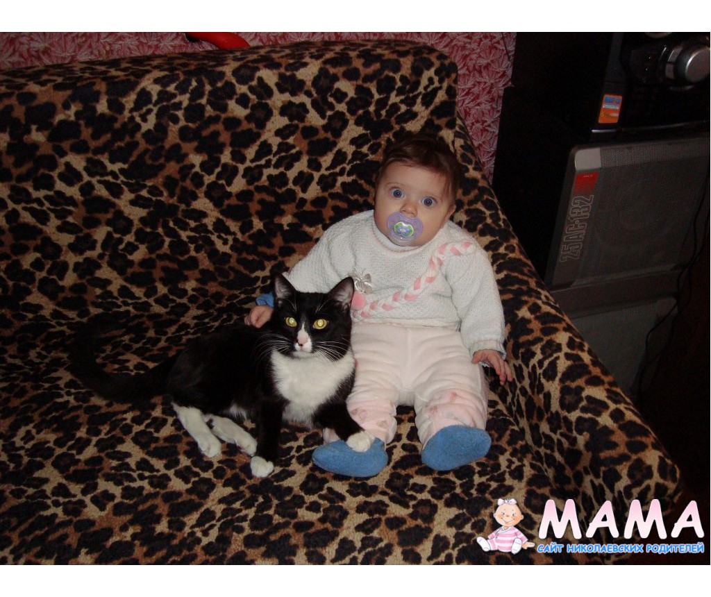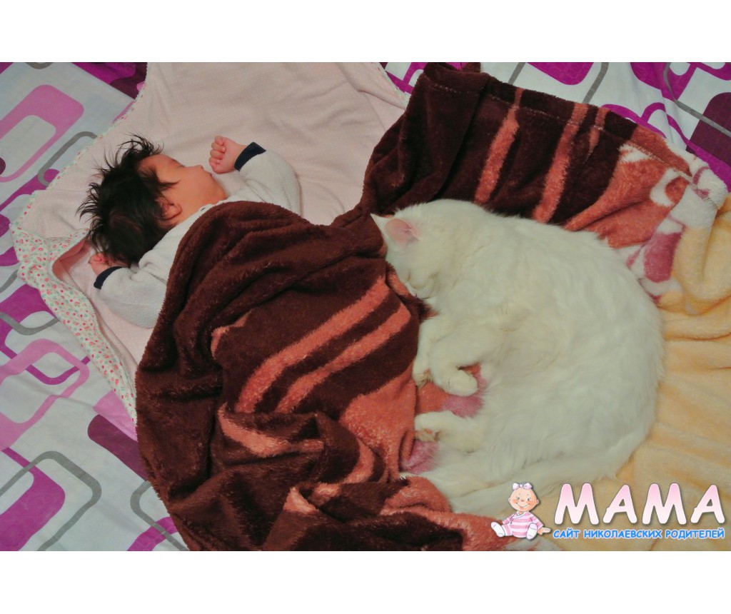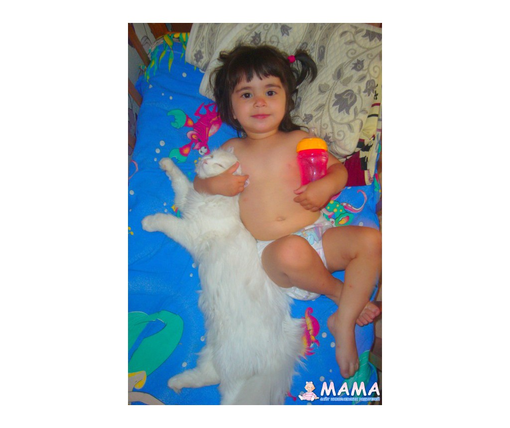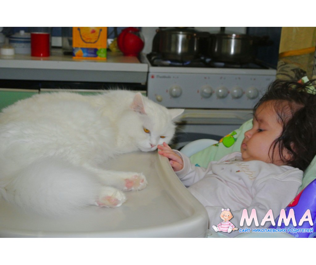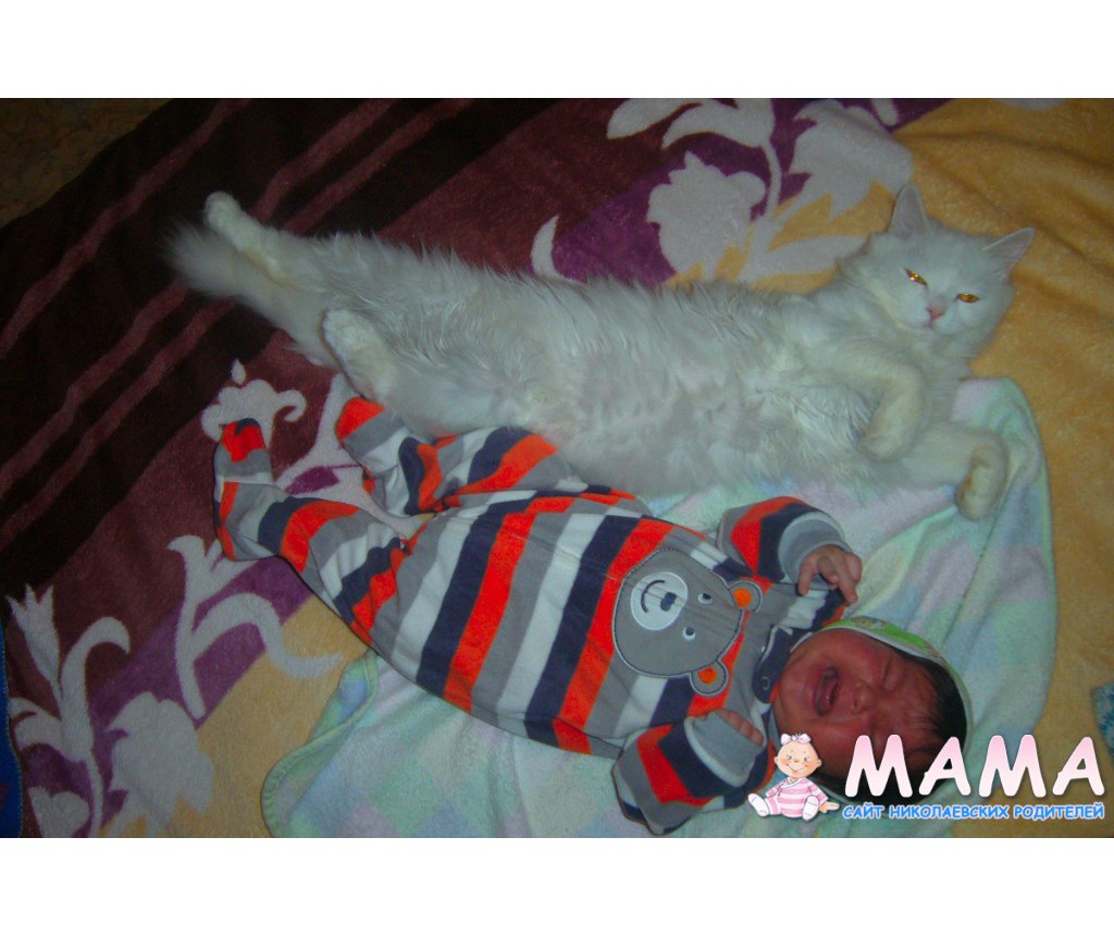 У нас было 2 кота, но так как они дрались пришлось одного отдать. Но он малышку не трогает, когда она у нас на кровати днем спит, он ложится рядом, а если мы мы ее поздно купаем и она сонная в ванночке начинает кричать из-зи того, что хочет уже спатки, кот сначала бегает вокруг ванночки и орет, а потом начинает нас кусать, а она от него в восторге=) И еще хомячок у нас живет))